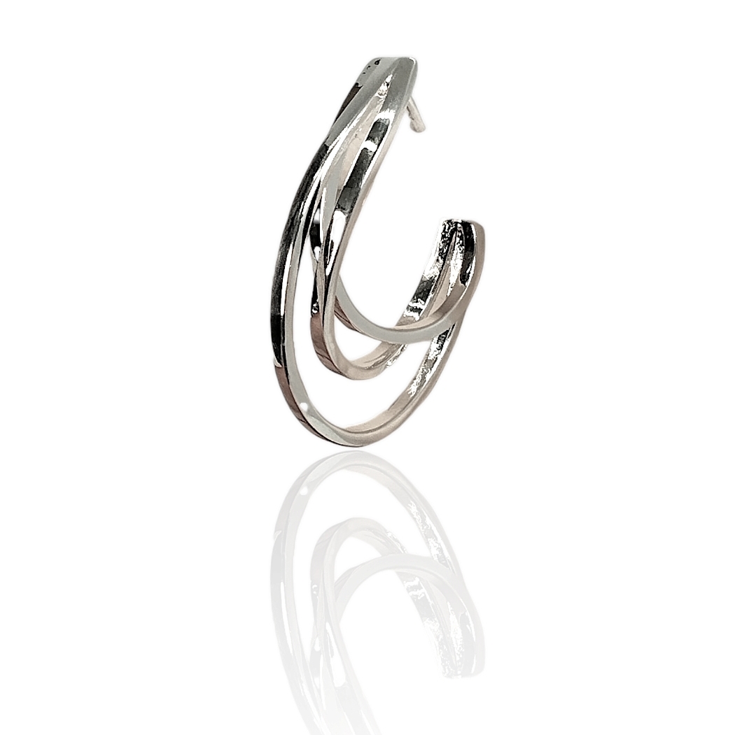 O destaque está nos três fios metálicos curvados, que juntos desenham uma lua crescente estilizada. Cada fio tem uma leve diferença de curvatura, criando camadas visuais e fluidez no visual. É como carregar um pedacinho do céu com você.