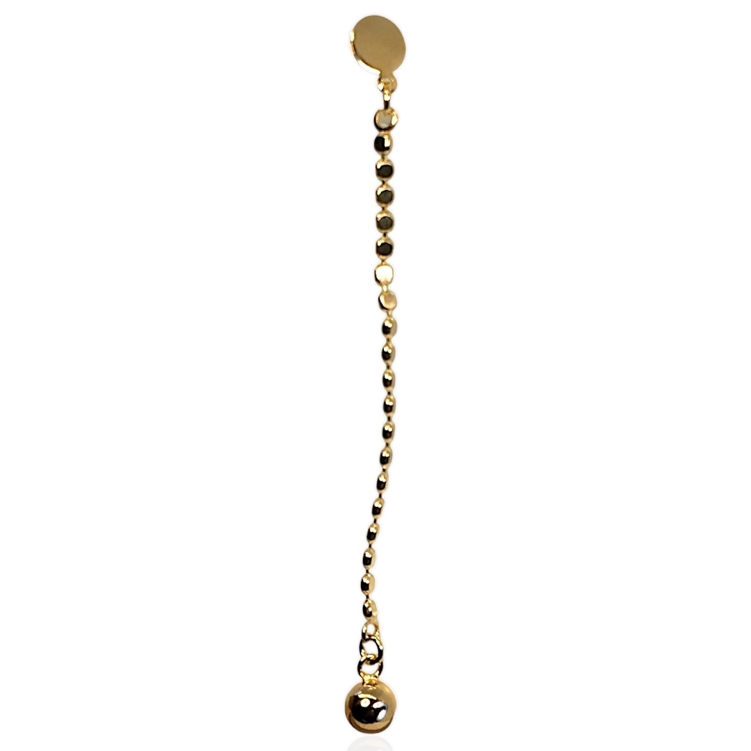 Sua estrutura delicada apresenta uma sequência de pequenas medalhas douradas, que se movimentam com graciosidade, criando um efeito visual encantador. Na extremidade, uma esfera polida e brilhante finaliza o design com sofisticação, trazendo peso visual e um toque contemporâneo ao look.